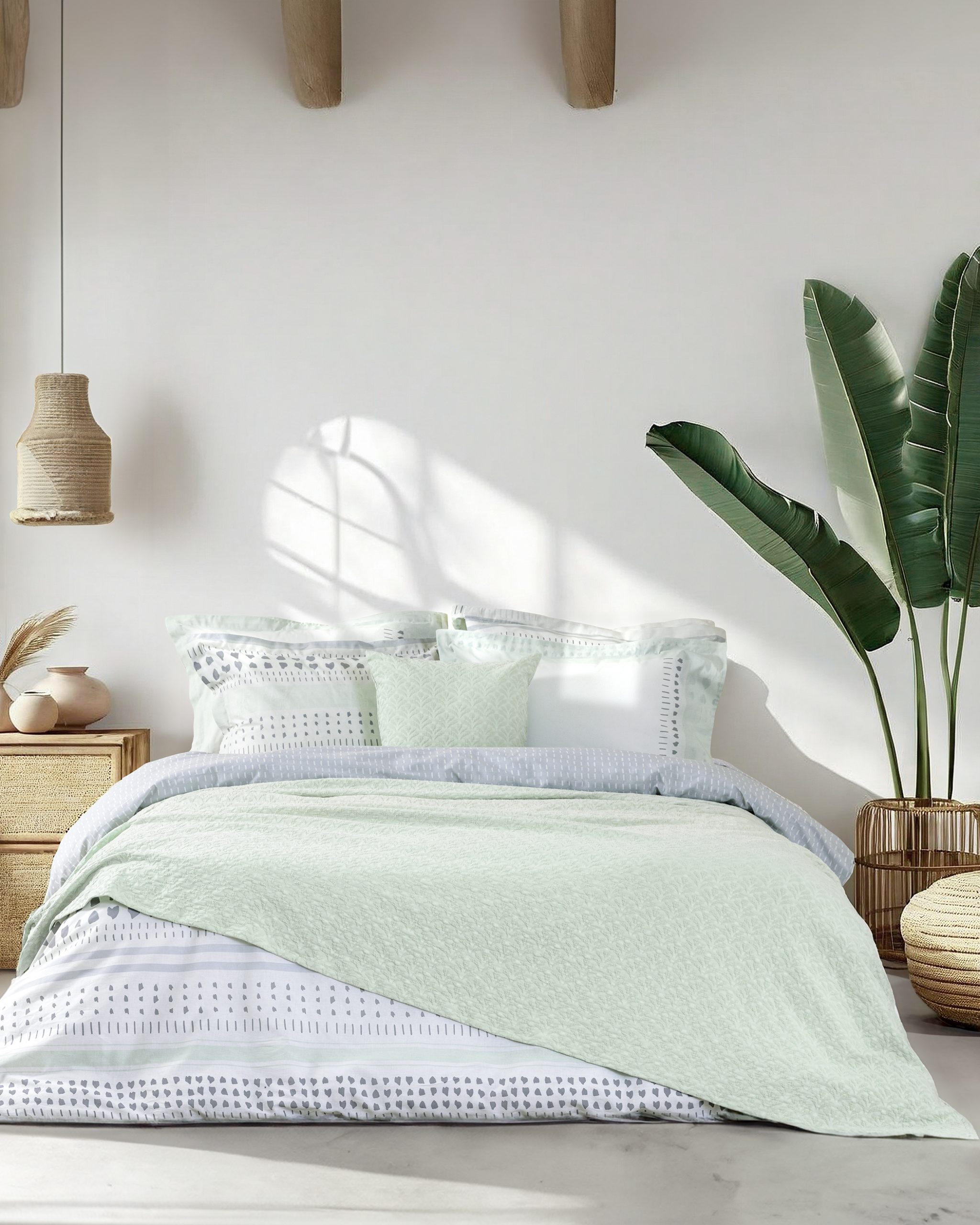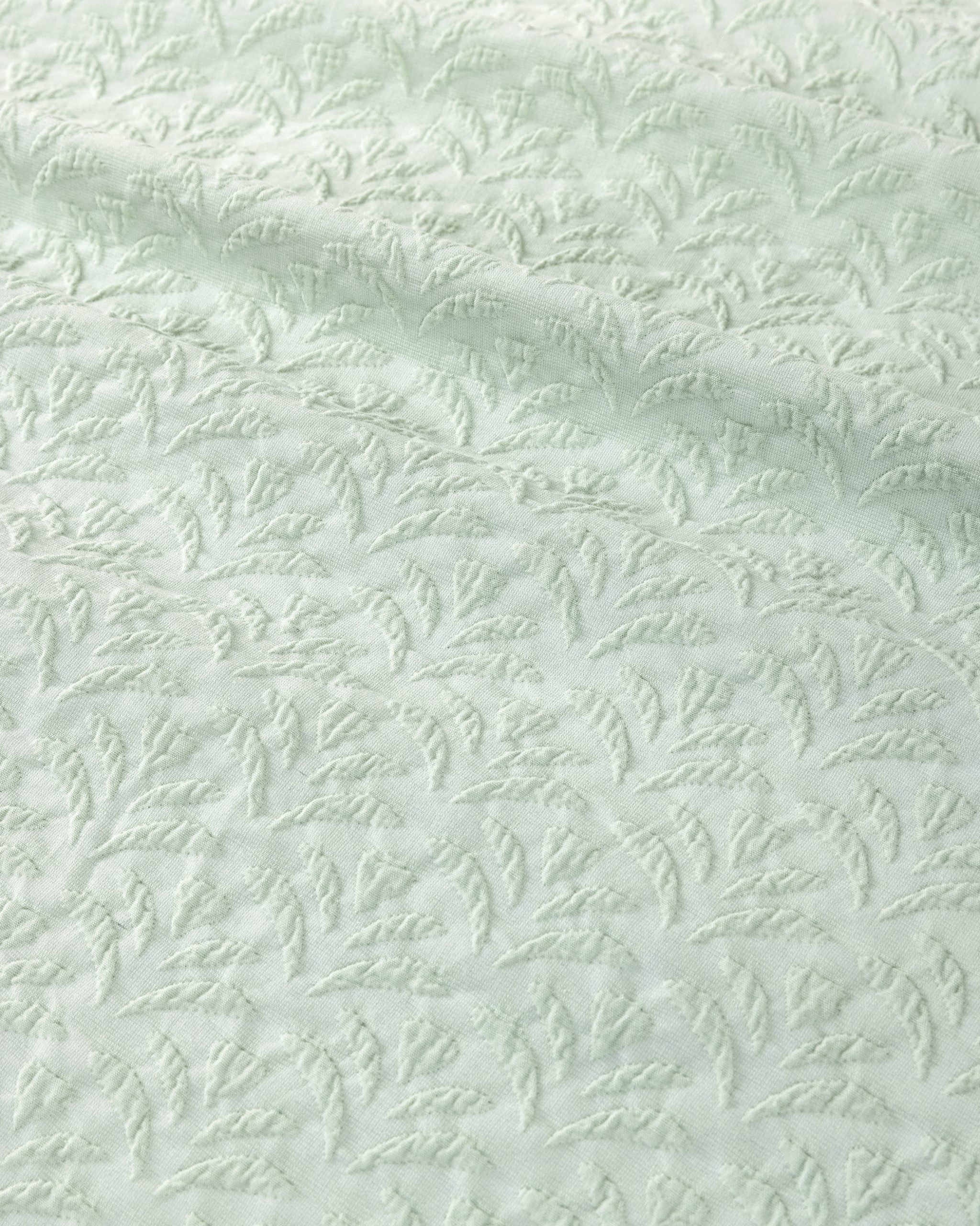 Κουβέρτα βαμβακερή τύπου matelasse, σε ζακάρ πλέξη. Απόλυτα ελαφριά και δροσερή, με μαλακή αίσθηση. Είναι η ιδανική λύση για τους καλοκαιρινούς μήνες αλλά και σαν διακόσμηση κρεβατιού καθ’ολη τη διάρκεια του χρόνου. Έχει ανάγλυφο φλοράλ σχέδιο σε απαλές παστέλ αποχρώσεις.