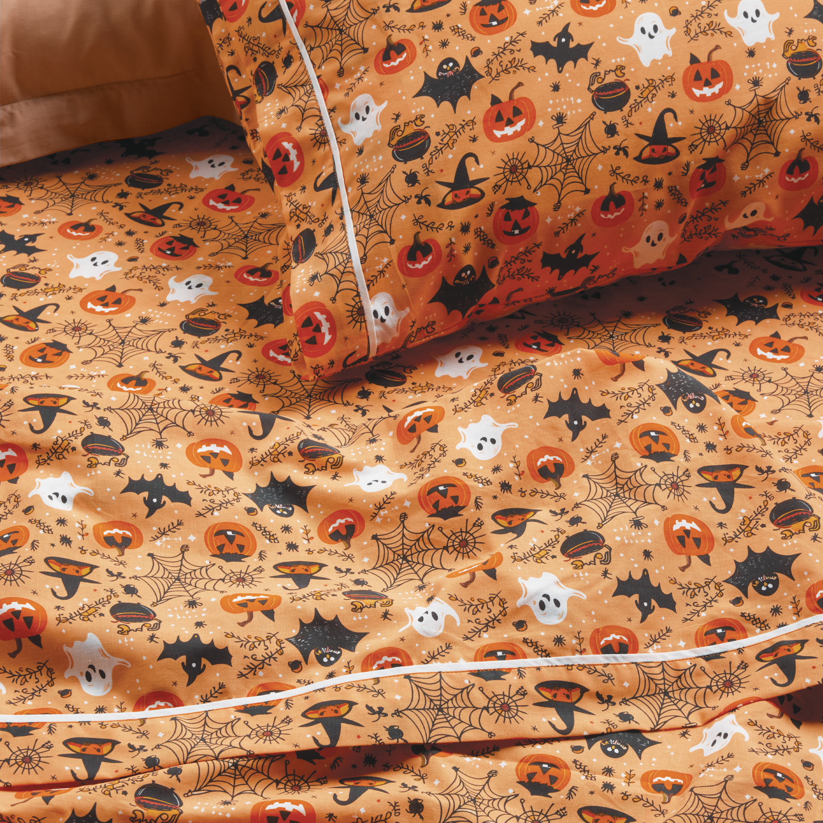 Σετ σεντόνια της σειράς Kid, σε σχέδιο Halloween. Είναι από 70% υποαλλεργικό βαμβάκι και 30% πολυεστέρα με πυκνότητα ύφανσης 150 TC, απαλό στην αφή & ανθεκτικό στη χρήση. Το σετ περιλαμβάνει ένα πανωσέντονο 170Χ260εκ, ένα κατωσέντονο 170X260εκ και μία μαξιλαροθήκη 50×70εκ. Das home…makes your house a home!