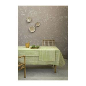 Αλέκιαστο τραπεζομάντηλο με επεξεργασία ”teflon”. Το ύφασμα διατηρεί την μαλακή και φυσική του υφή, ενώ ταυτόχρονα γίνεται αδιάβροχο και μπορεί να προστατευτεί από τους λεκέδες. Τυπωμένο με ανεξίτηλα ανθεκτικά χρώματα.