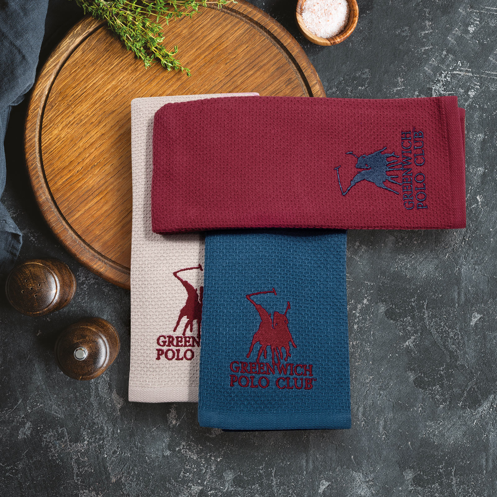 Πετσέτες βαμβακερές, έξτρα απορροφητικές και ανθεκτικές στις πολλές πλύσεις, της εταιρίας Greenwich Polo Club, για να ομορφύνουν την κουζίνα σας.