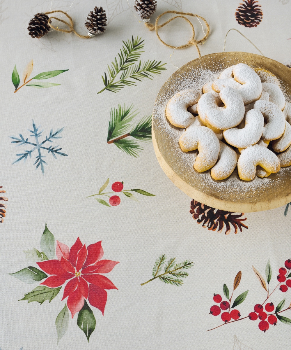 Δώστε στην τραπεζαρία σας γιορτινή αύρα με τραπεζομάντηλα σε χριστουγεννιάτικα σχέδια, από την εταιρία Kentia. Τα τραπεζομάντηλα της σειράς είναι εύκολα στην χρήση και ανθεκτικά στις συχνές πλύσεις.