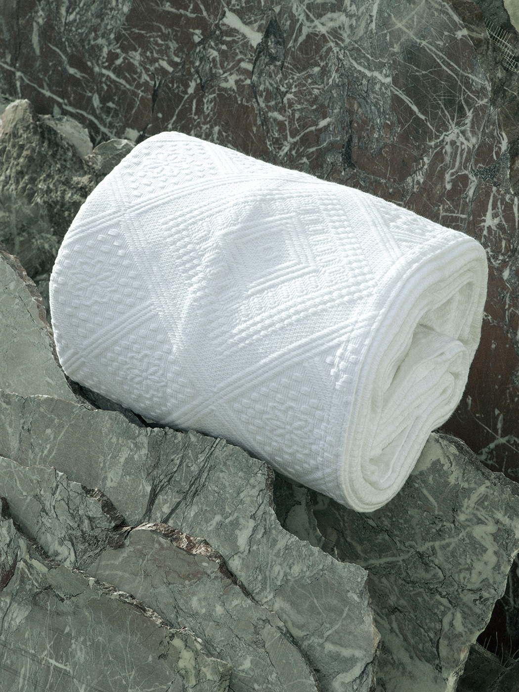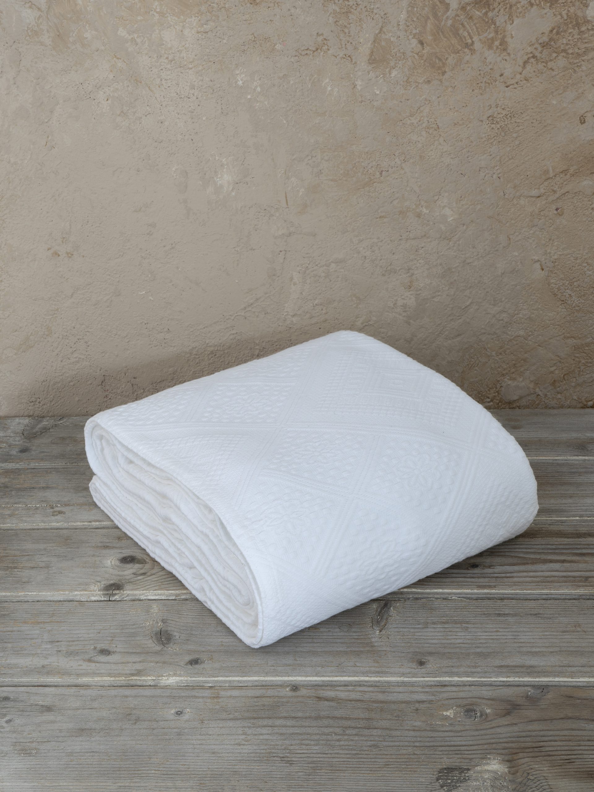 Koυβέρτα λευκή ζακάρ, από 100% βαμβακερά νήματα βάρους 420 gr/m2. Η ιδανική κουβέρτα για να αναδείξει και να διακοσμήσει το κρεβάτι και για να χρησιμοποιηθεί σαν σκέπασμα την Άνοιξη και το Καλοκαίρι. Έχει μαλακή αίσθηση και ανάγλυφο ζακάρ σχέδιο, ethnic αισθητικής, με ρόμβους και λουλούδια. Μια κουβέρτα που θα χαρίσει πλούσια και όμορφη εικόνα στο δωμάτιο με την υφή και την αισθητική της. Χάρη στη φυσική βαμβακερή της σύνθεση είναι υποαλλεργική και το ύφασμά της αναπνέει και είναι φιλικό προς το δέρμα, χωρίς να ηλεκτρίζεται. Προσφέρει πολύ άνετο και ξεκούραστο ύπνο. Έχει φινίρισμα με διπλό γαζί που της προσφέρει ακόμα μεγαλύτερη αντοχή στο χρόνο και στις πλύσεις. Είναι ανθεκτική στο χρόνο και μπορεί να πλυθεί σε θερμοκρασίες έως 40ο.
