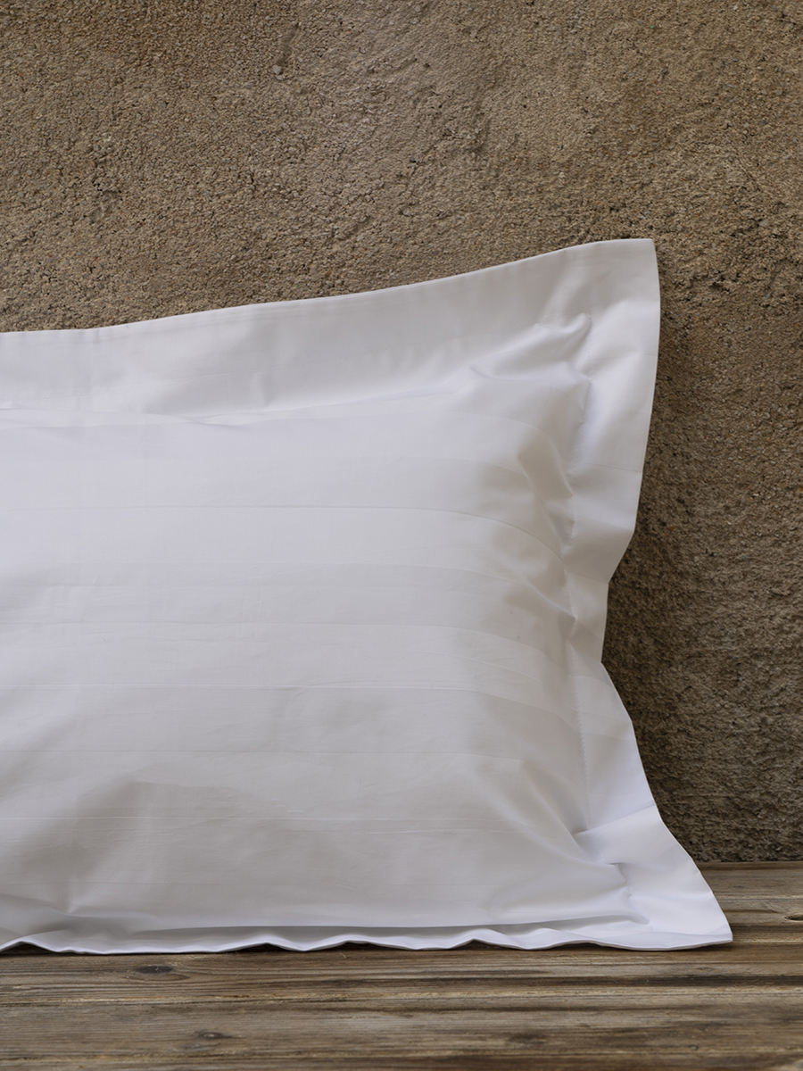 Μια πολυτελής λευκή μαξιλαροθήκη ανώτερης ποιότητας με φαρδιές ανάγλυφες ρίγες 4,5 cm στην ύφανσή της, που έχει υποβληθεί σε ειδική επεξεργασία mercerization ώστε να έχει πιο φίνα, λαμπερή και απαλή υφή, έχει μεγαλύτερη ανθεκτικότητα και είναι ευκολότερη στο σιδέρωμα. Επιπλέον, έχει υποβληθεί σε επεξεργασία sanfor ώστε να διατηρεί τη σταθερότητα των διαστάσεών της και να μη ζαρώνει ή συρρικνώνεται κατά το πλύσιμο. Μια μαξιλαροθήκη που θα προσφέρει πολύ πλούσια αίσθηση, άνετο ύπνο και εξαιρετικά υψηλή αντοχή στις συχνές πλύσεις και στο σιδέρωμα. Έχει επεξεργασία anti-pilling ώστε να αποτρέπεται η δημιουργία κόμπων στο ύφασμα και μπορεί να πλυθεί στους 90ο C.
