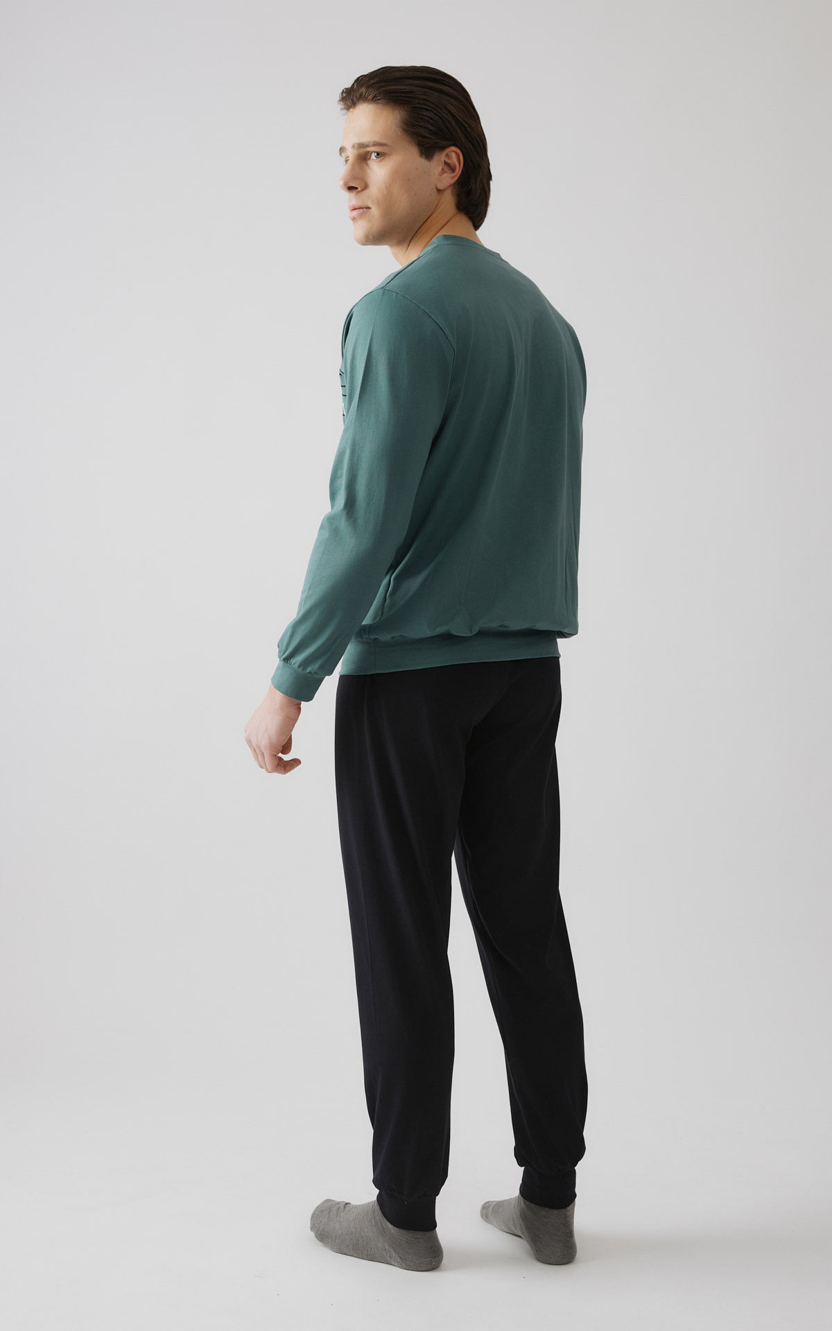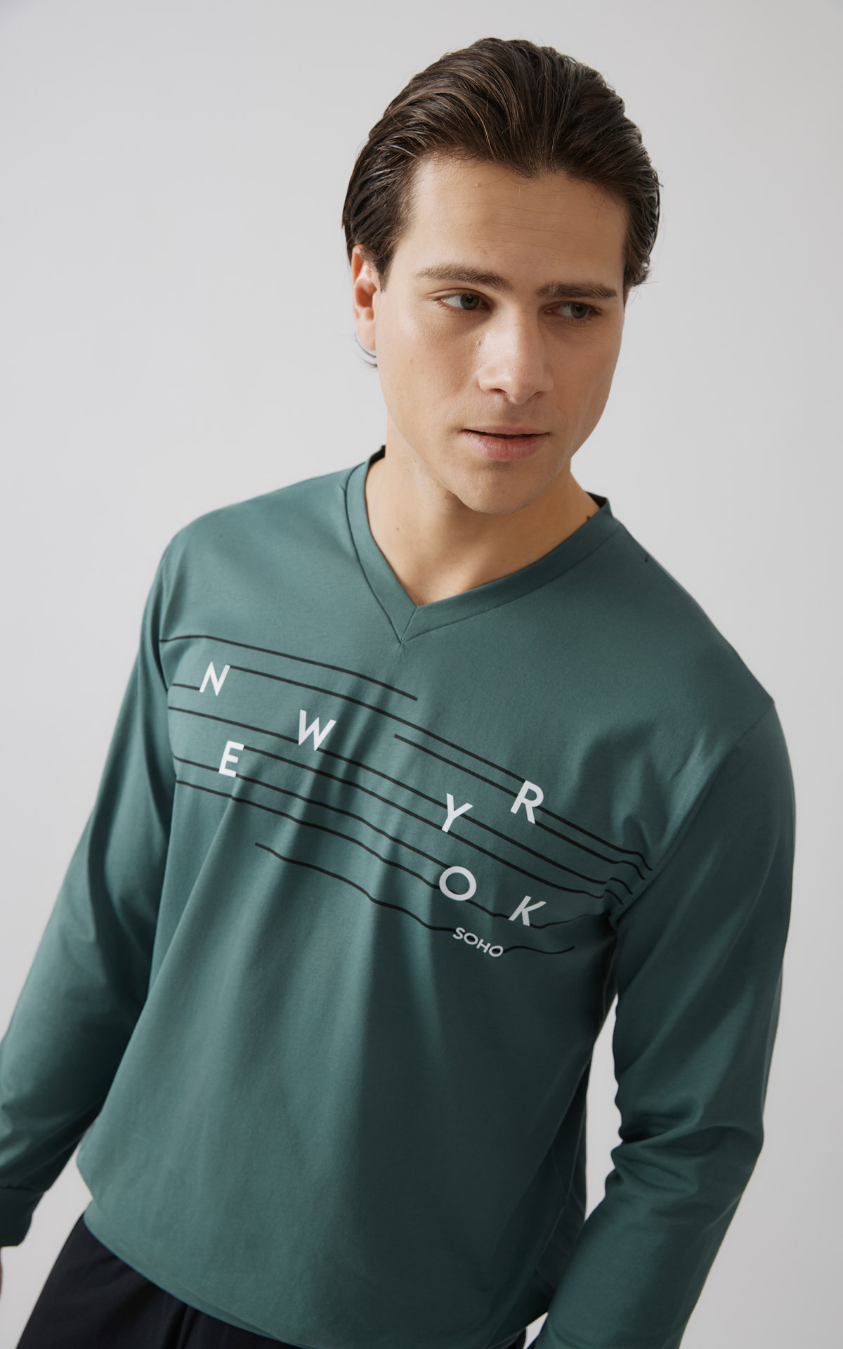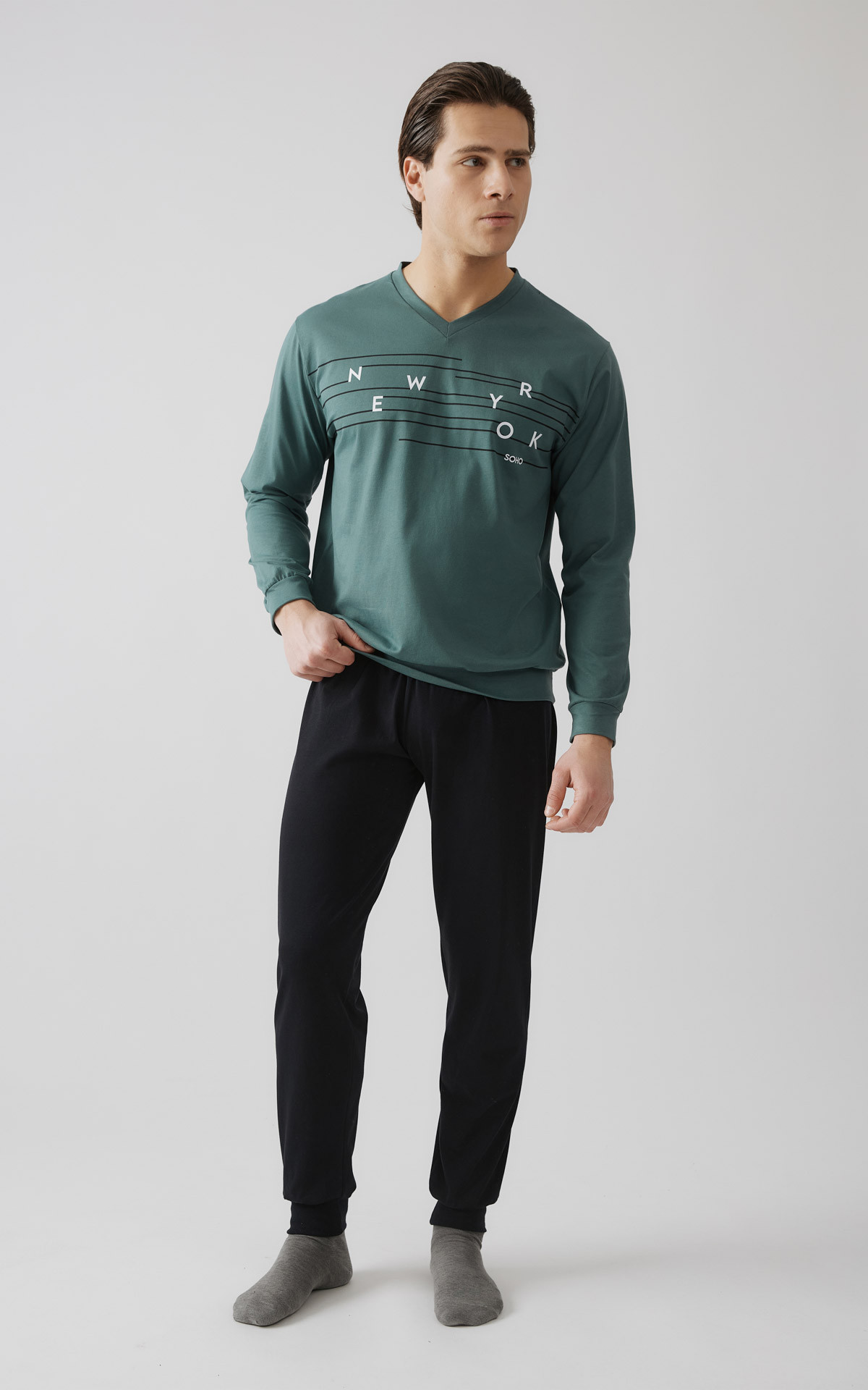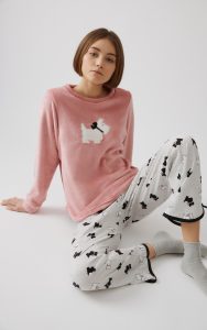 Χειμερινή πυζάμα, από 100% βαμβάκι εξαιρετικής ποιότητος. Το σετ περιλαμβάνει μπλούζα με V λαιμόκοψη, τύπωμα στο στήθος και παντελόνι μπάσκες στα τελειώματα.
