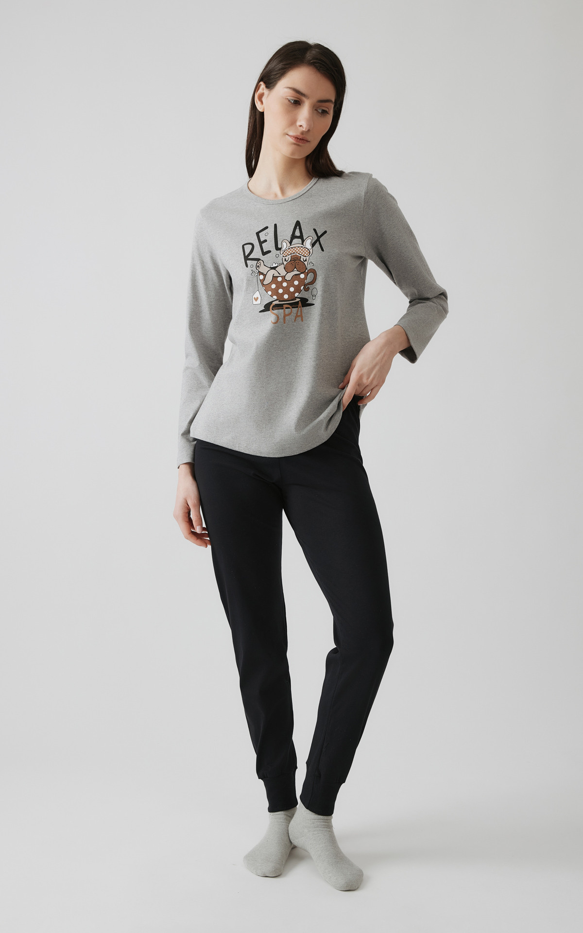 Χειμερινή πυζάμα από 100% βαμβακερό ύφασμα, υψηλής ποιότητας, μονόχρωμο. Το σετ περιλαμβάνει μπλούζα μακρυμάνικη με στρογγυλή λαιμόκοψη, τύπωμα στο στήθος και μακρύ παντελόνι με μπάσκες στα τελειώματα.