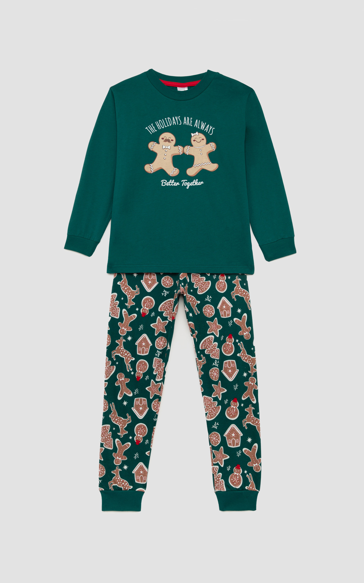 Παιδική unisex χειμερινή Χριστουγεννιάτικη πιζάμα από 100% βαμβακερό ύφασμα, υψηλής ποιότητας. Το σετ περιλαμβάνει μπλούζα μακρυμάνικη με στρογγυλή λαιμόκοψη, χριστουγεννιάτικο τύπωμα στο στήθος και παντελόνι τυπωμένο all over, με μπάσκες στα τελειώματα. Συνδυάστε το με τις αντίστοιχες γυναικείες και ανδρικές, για την απόλυτη γιορτινή ατμόσφαιρα