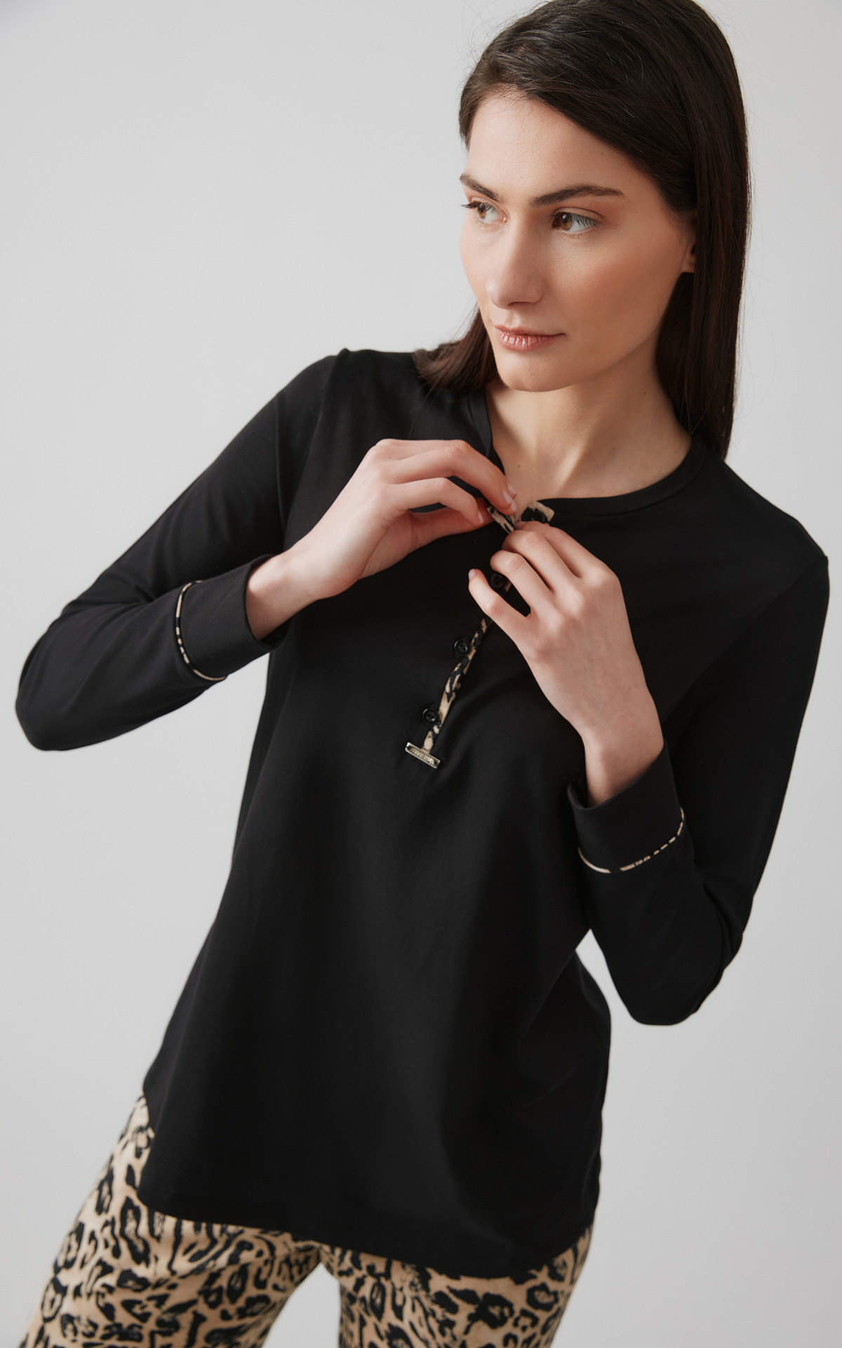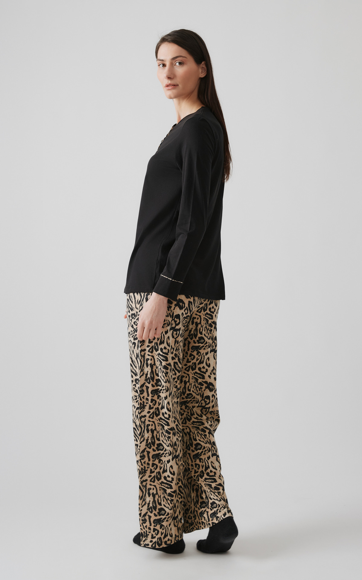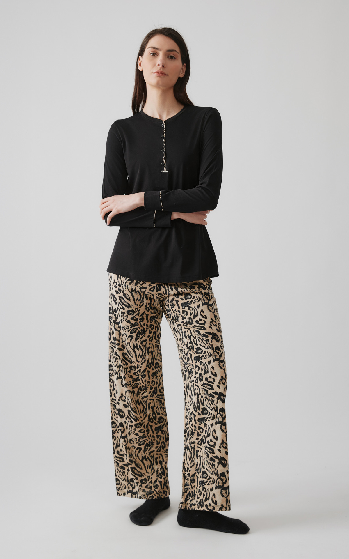 Χειμερινή πυζάμα από 50% TENCEL™ Modal & 50% βαμβάκι υψηλής ποιότητας. Η μίξη αυτών των δύο φυσικών ινών προσδίδει ένα εξαιρετικό αποτέλεσμα, ιδανικό για πιζάμες και άνετα ρούχα. Το σετ περιλαμβάνει μακρυμάνικη μπλούζα με τύπωμα στο στήθος και παντελόνι τυπωμένο all over animal, ίσιο.