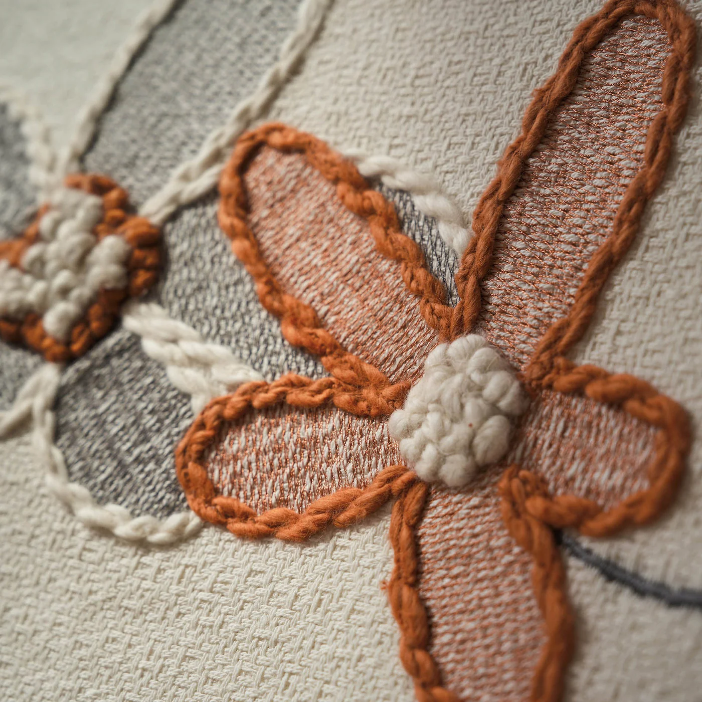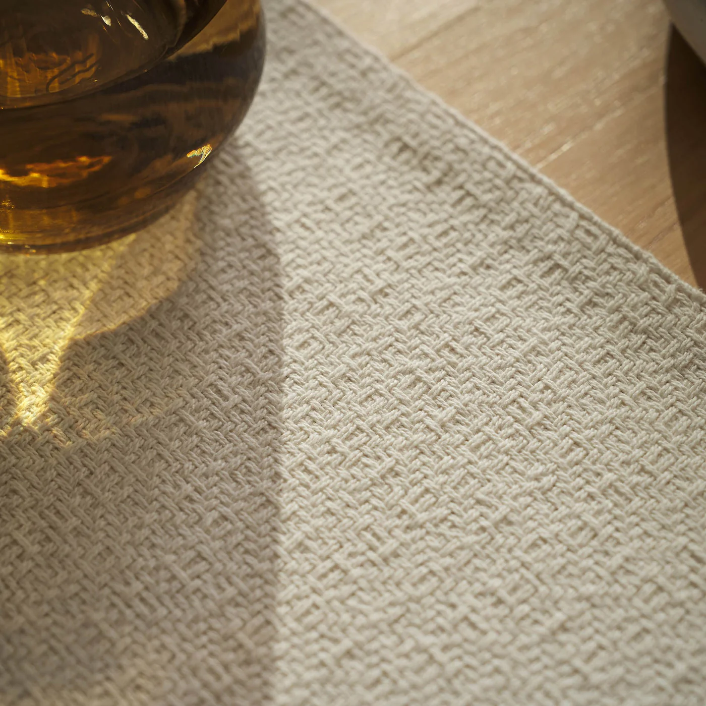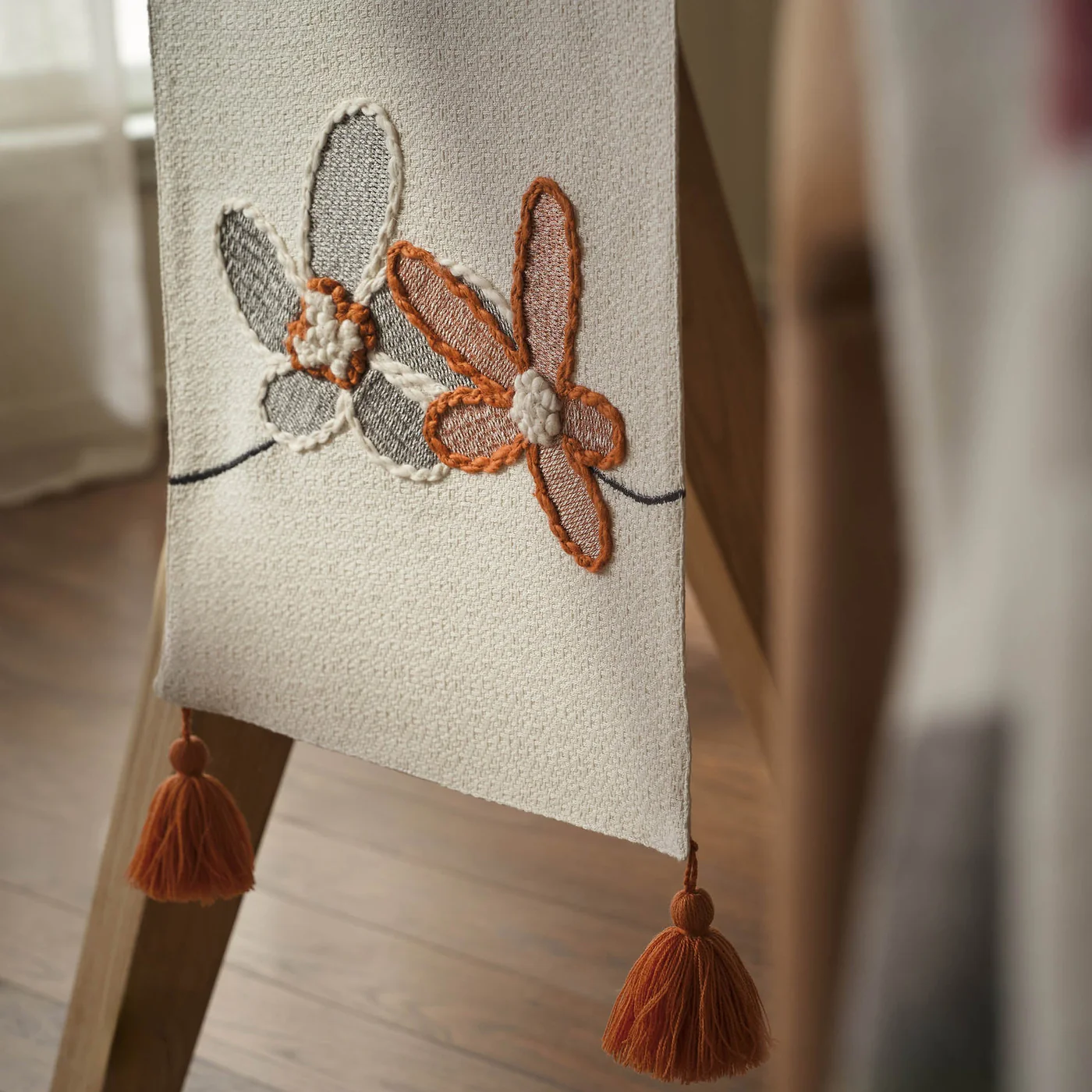 Κεντημένη βαμβακερή τραβέρσα σε ψαθωτό ύφασμα με χειροποίητες λεπτομέρειες και χρωματιστά φουντάκια.