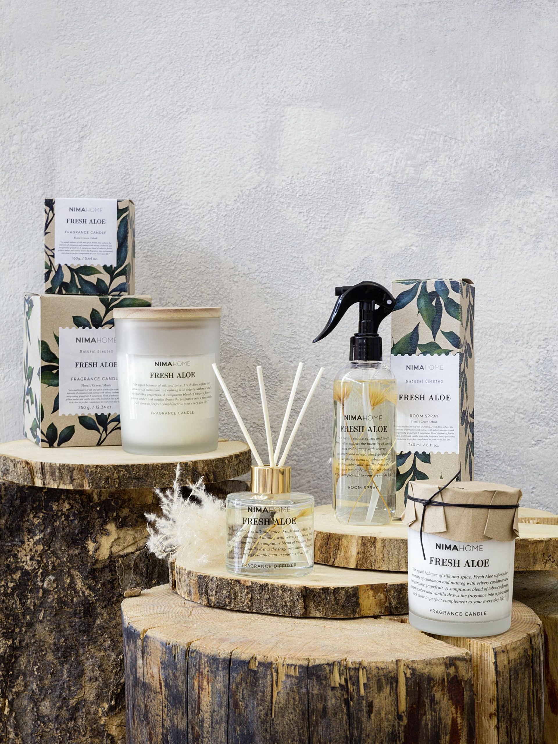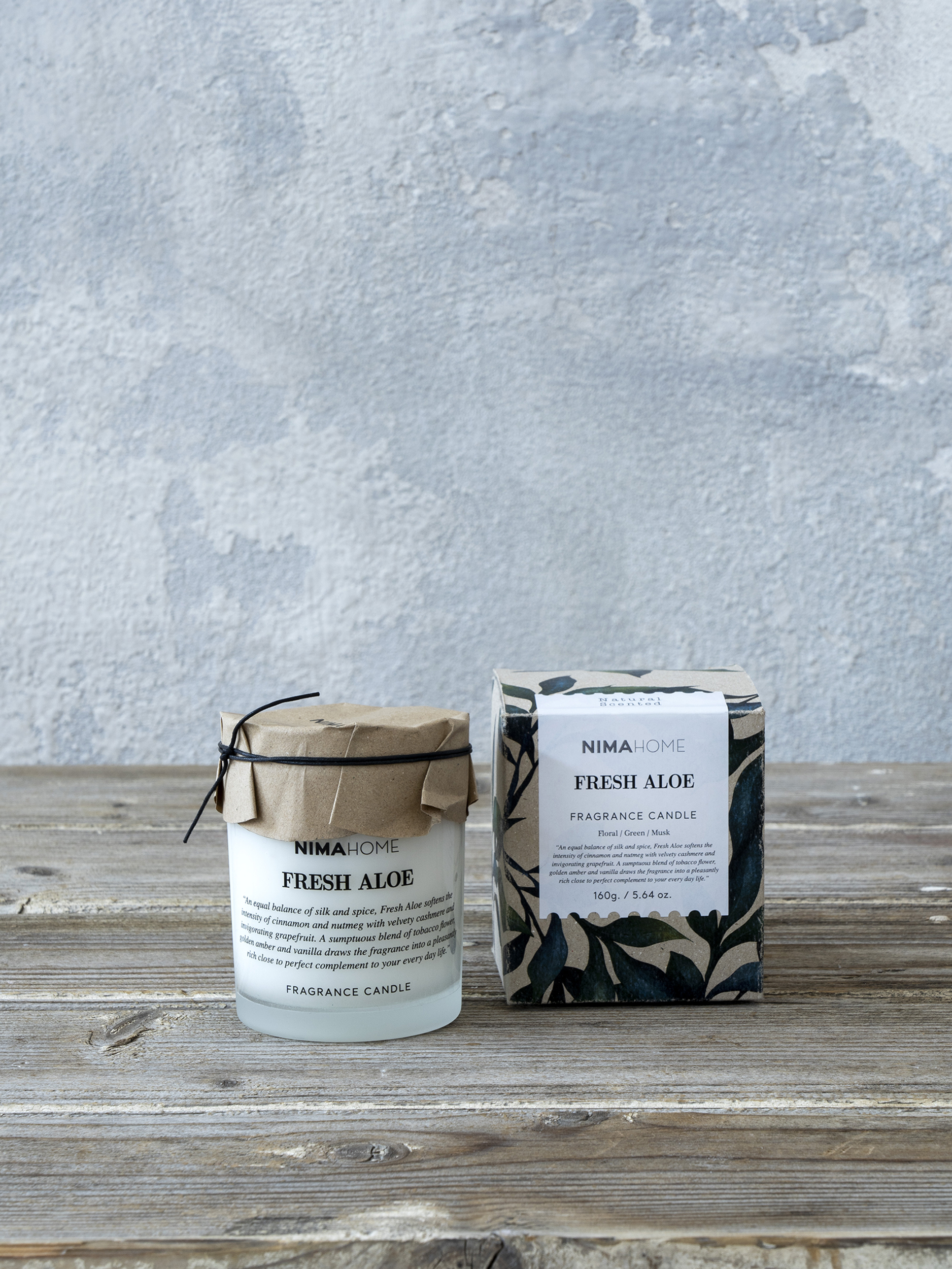Αρωματικό κερί σε γυάλινο βαζάκι για να διακοσμήσετε το χώρο σας από την εταιρεία Nima. Το άρωμά του Fresh Aloe συνδυάζει δροσερές νότες χλωρής βλάστησης, λουλουδιών και musk.