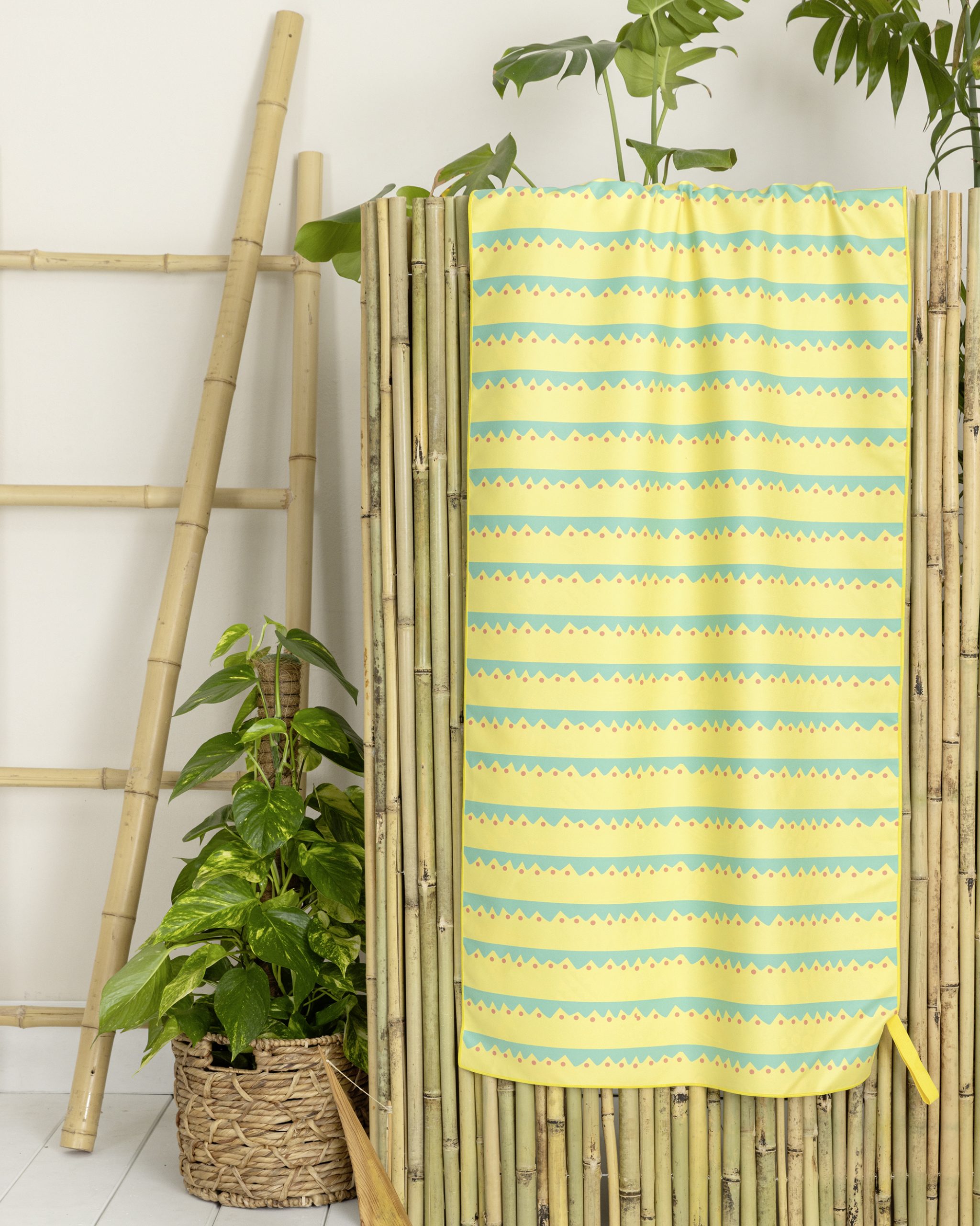 Πετσέτα θαλάσσης με σύνθεση microfiber και τεχνολογία quick dry, που στεγνώνει γρήγορα μετά από κάθε χρήση. Τα υφάσματα από microfiber έχουν πυκνή ύφανση από εξαιρετικά λεπτά νήματα ώστε να είναι ιδιαίτερα μαλακά και απαλά στην υφή. Διαθέτει μια πρακτική θηλιά από φαρδύ λάστιχο, που την τυλίγει, ώστε να κάνει εύκολη τη μεταφορά της στην παραλία και σε κάθε δραστηριότητα. Είναι ιδανική για τις διακοπές και τα ταξίδια καθώς πιάνει ελάχιστο χώρο, είναι ελαφριά, στεγνώνει και καθαρίζει εύκολα, χαρίζοντας ταυτόχρονα ξεχωριστό στιλ.