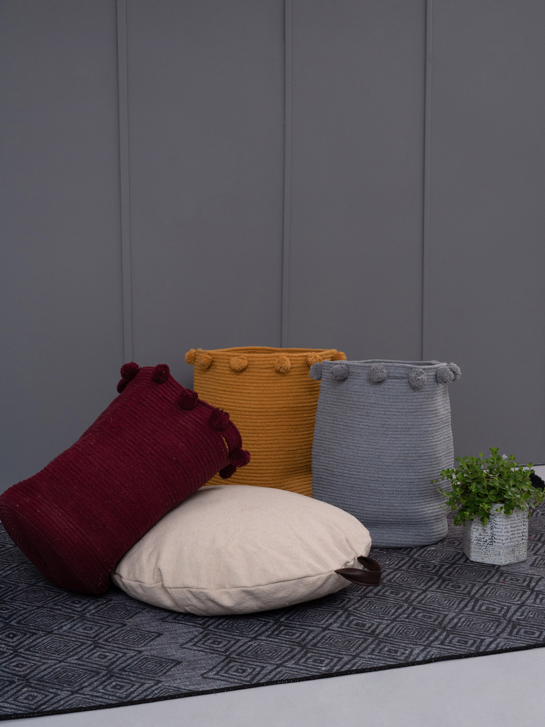Καλάθι αποθήκευσης με περιμετρικά πον πον, της εταιρίας Palamaiki, για το όλους τους χώρους του σπιτιού.