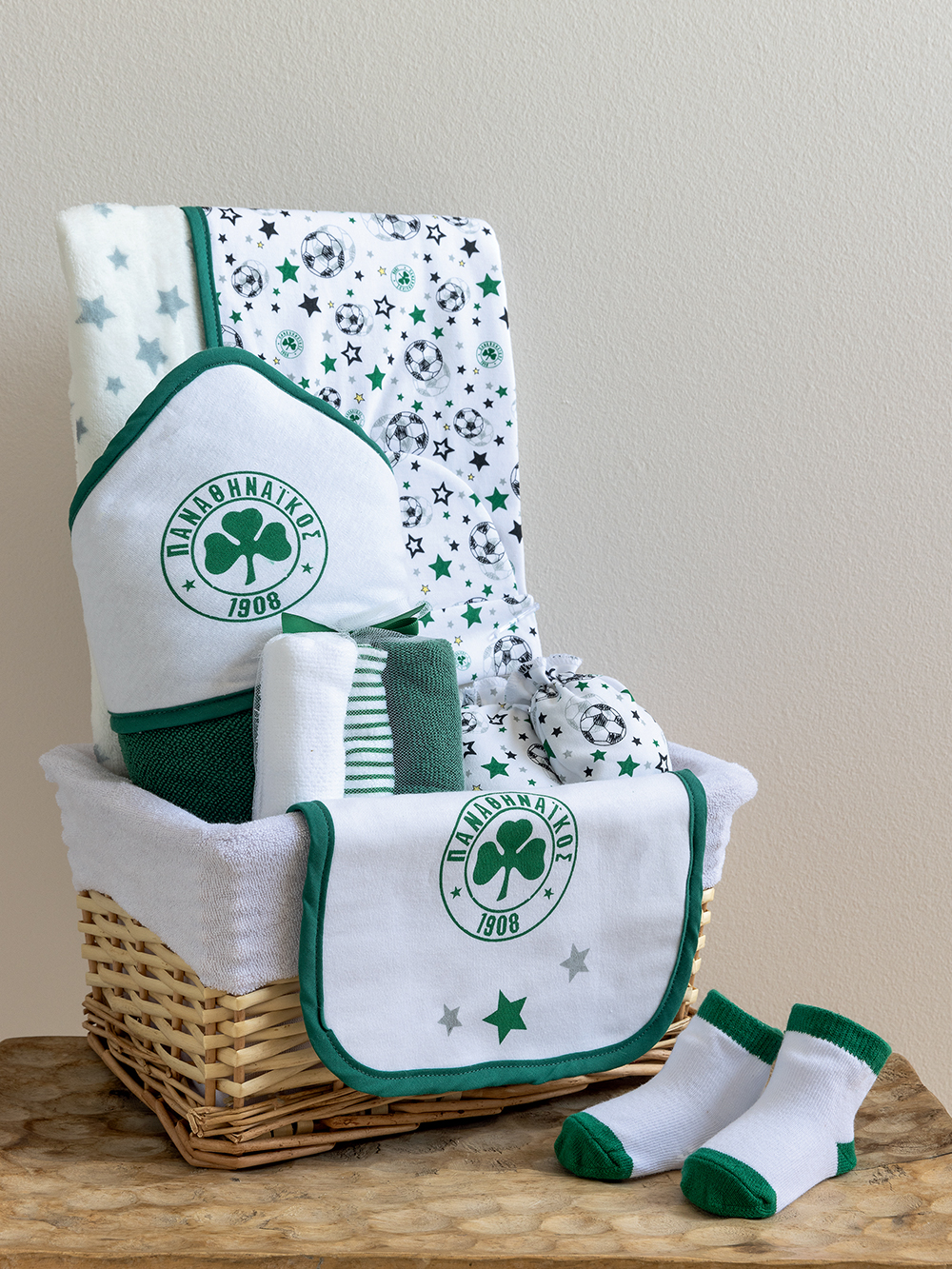 Καλάθι δώρου για νεογέννητο με κουβέρτα fleece, κάπα, λαβέτα, σαλιάρα, πανάκια 3 τμχ, σκουφάκι, γαντάκια, καλτσάκια, από την εταιρία Palamaiki.